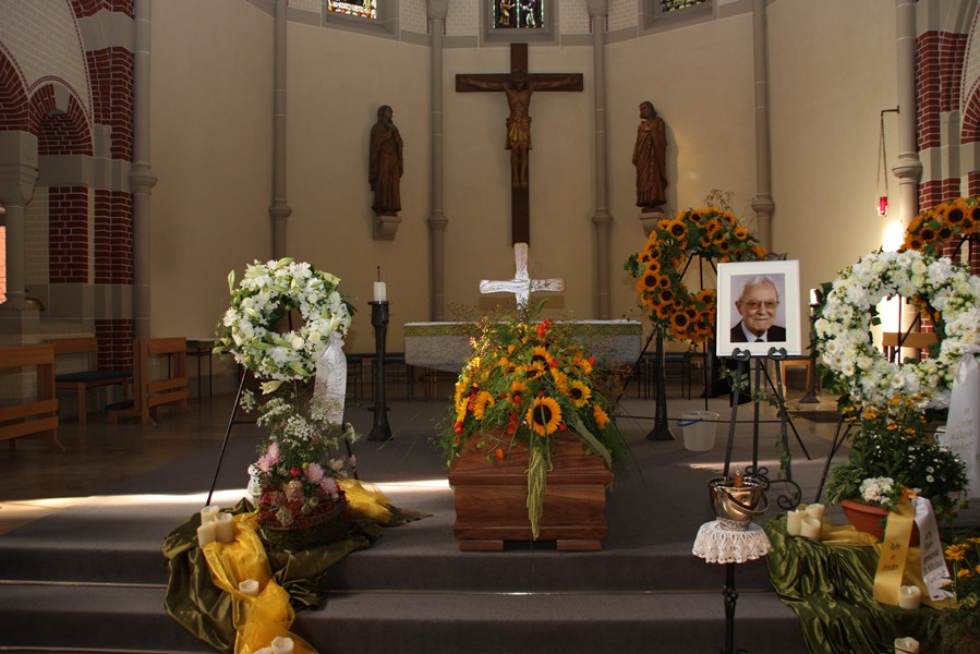 Pfarrer Friedbert Böser leitete den Gottesdienst zusammen mit Pfarrer Reinholdt Lovasz mit den Lesungen und Gebeten am Sarg des Verstorbenen. Musikalisch begleitet wurde die Feier von Dr. Lothar Gaa an der Orgel und dem MGV Sängerbund – Liedertafel mit seinen Gesängen „Ich bete an die Macht der Liebe“ und „Abend wird es wieder“– Liedertafel unter der Leitung von Franz-Josef Siegel, sowie von der Gemeinde mit den Liedern „Wohin soll ich mich wenden“ und „Wir sind nur Gast auf Erden“.