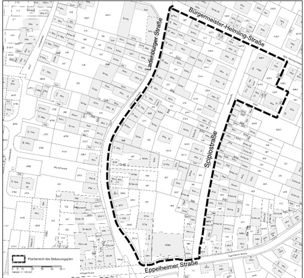 Der Geltungsbereich des Bebauungsplans „Scipiostraße - 4. Änderung (472,9 KB)“ umfasst eine Fläche von ca. 2,5 ha und beinhaltet die Flurstücke Nr. 112/9, 335/3, 335/7, 367, 367/1, 367/2, 371, 371/1, 372, 372/1, 373, 373/1, 374, 374/1, 375, 375/1, 375/2, 376, 376/1, 377, 377/1, 378, 378/1, 379, 380, 381, 381/1, 381/2, 381/3, 382, 383, 383/1, 384, 385, 386/4, 386/5, 386/6, 387, 387/1, 388, 390, 390/1, 391, 392, 393, 394, 424/2, 425/2, 425/3, 425/4, 426/1, 426/2. Maßgebend ist der Geltungsbereich, wie er im Lageplan, wie nachstehend abgedruckt, dargestellt ist.