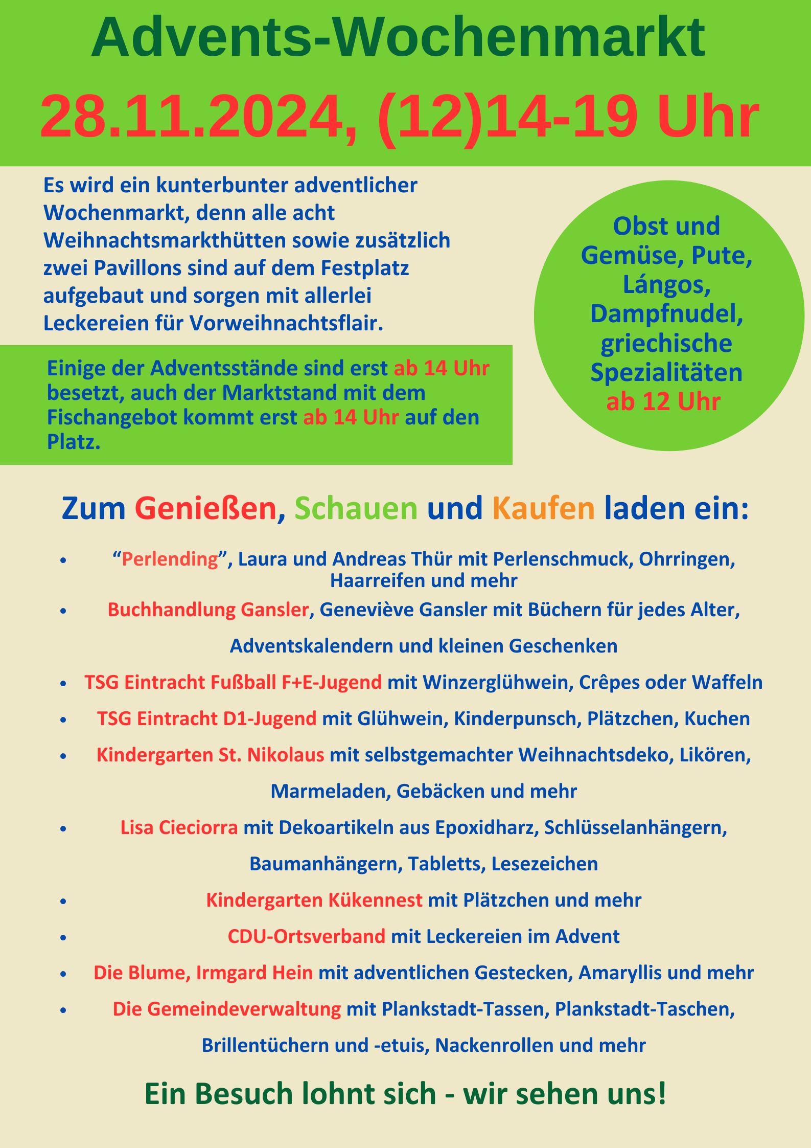 An diesem Donnerstag verwandelt sich der Plankstadter Wochenmarkt in einen festlichen Adventswochenmarkt. Auf dem Festplatz können Besucher zwischen 12 und 19 Uhr, einige der zusätzlichen Stand-Anbieter kommen erst gegen 14 Uhr in ihre Weihnachtsmarkthütten auf dem Festplatz, die weihnachtliche Atmosphäre genießen und sich auf die bevorstehende Adventszeit einstimmen. Während die regulären Wochenmarkthändler, dabei Michael Klever mit Obst, Gemüse, Angelika Stephan mit dem Pfälzer Dampfnudelhäusel, griechischen Spezialitäten von und mit Vassilios Eflampidis, Lángos mit Familie Schönig und Putenprodukte von Ulrichs Putenhof bereits ab 12 Uhr ihre Klappen öffnen, erweitert sich ab 14 Uhr das Angebot um Fischdelikatessen von Gocht's und adventlich dekorierte Hütten und Pavillons, die den Markt in einen vorweihnachtlichen Zauber tauchen. Besucherinnen und Besucher können sich auf eine breite Palette an weihnachtlichen Geschenken und Köstlichkeiten freuen.