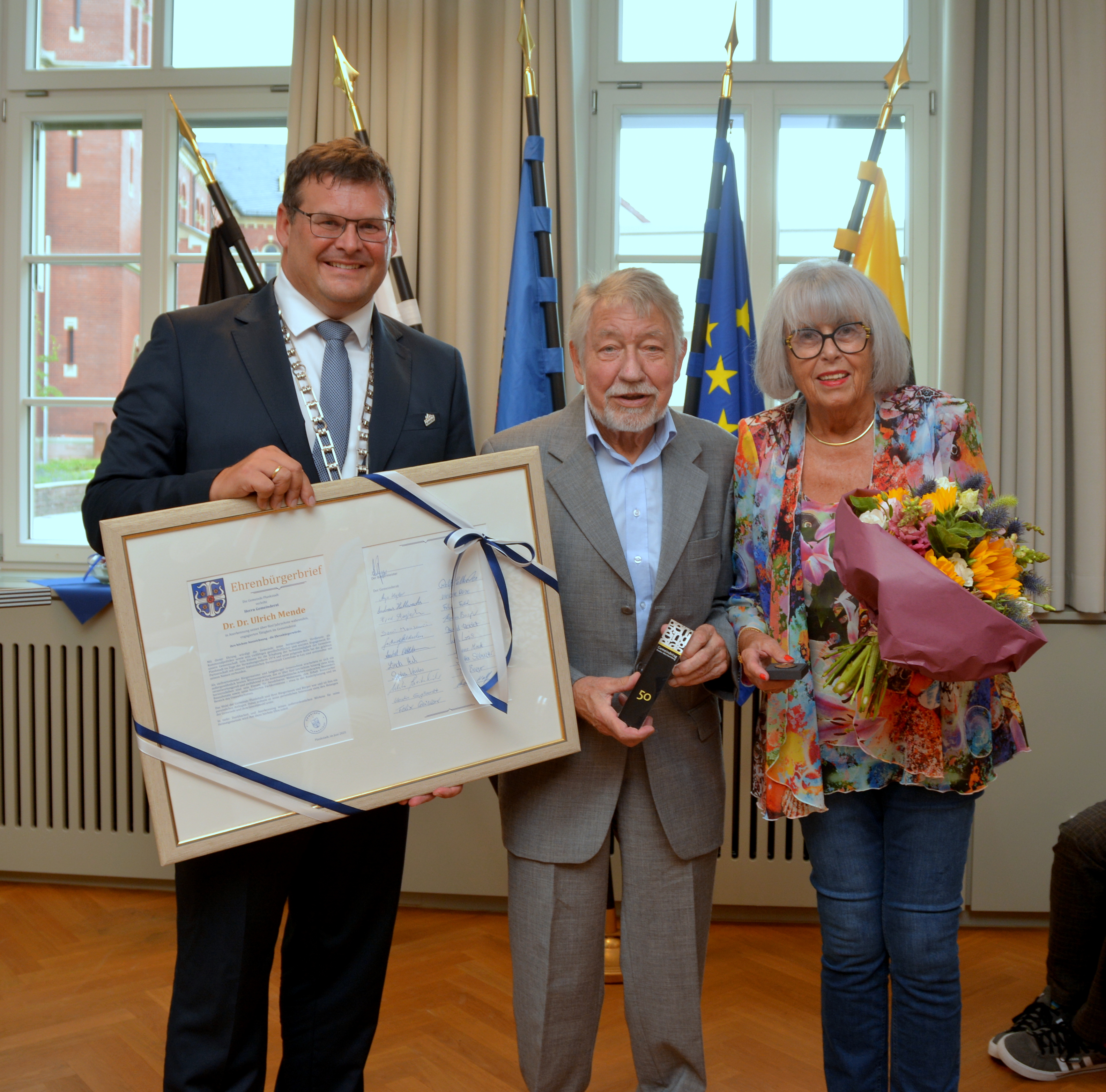 an diese Antwort seiner Mutter auf die bange Frage als Siebenjähriger, ob er an einer Diphterie-Erkrankung sterben müsse, erinnerte sich Dr. Dr. Ulrich Mende anlässlich der Auszeichnung mit der Ehrenbürgerwürde der Gemeinde. Spürbar angegriffen von der Verleihung, die unter anderem davon zeugt, dass Gott und das Leben viel mit ihm vorhatten, den vielen würdigenden Worte und der zahlreichen politischen und privaten Wegbegleiter, die zur Feierstunde direkt vor einer Gemeinderatssitzung gekommen waren, dankte Mende für die erwiesene Ehre. Diese endet damit noch nicht, denn auch der Quartiersplatz im Antoniusquartier wird in Kürze offiziell zum „Dr.-Dr.-Ulrich-Mende-Platz“ umbenannt. Der „Mensch“ Mende begrüßte zuerst in Dr. Wolfgang Hornung einen wahrlichen langjährigen Freund, mit dem er seit 1954 verbunden ist. Tiefer Dank gelte auch seiner Familie, der Gattin Brigitte, mit der er seit 1979 verheiratet ist, zu der auch die drei Kinder und vier Enkel zählen für deren Unterstützung, die ihm Kraft gebe.