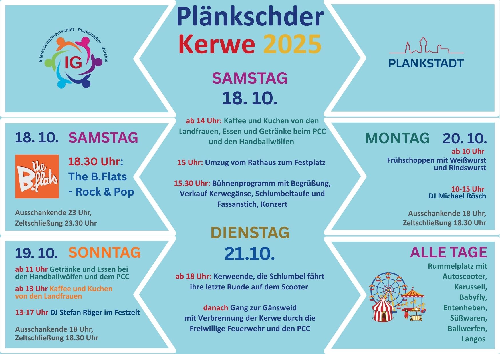 Während aller vier Kerwetage bringen die Schausteller Spiel und Spaß mit Autoscooter, Karussell, Langos, Entenheben, Süßwaren, Flieger, Ballwerfen und mehr nach Plankstadt.