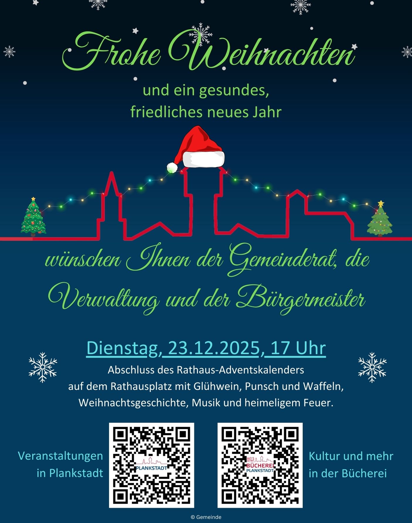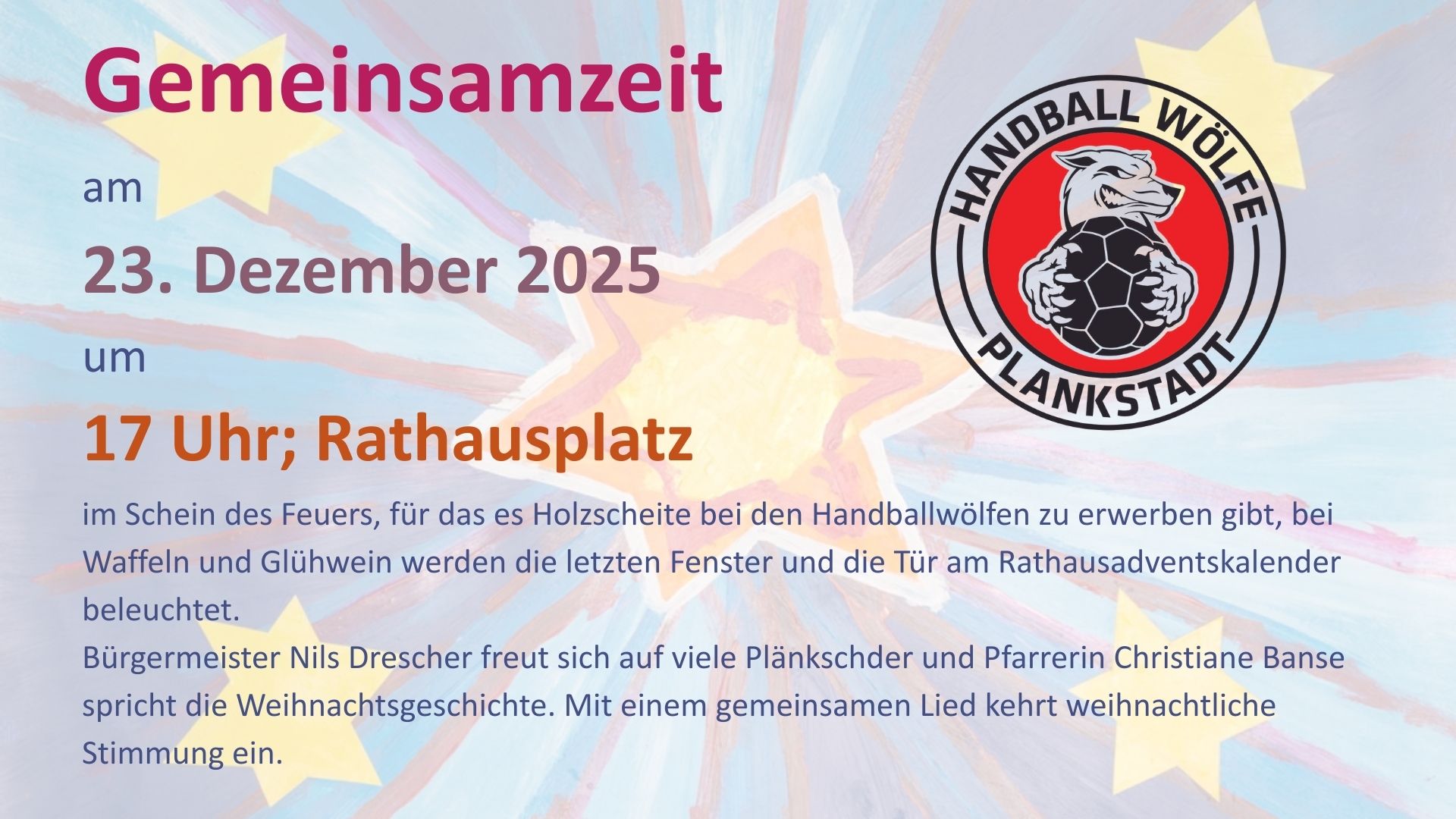 Im Schein des Feuers, für das man Scheite bei den Handballwölfen kaufen kann, liest Pfarrerin Christiane Banse die Weihnachtsgeschichte vor, gemeinsam mit Bürgermeister Nils Drescher wird zu Melodien die der Musikverein spielt, gesungen, die letzten Fenster und die Tür des Rathauses werden erleuchtet.